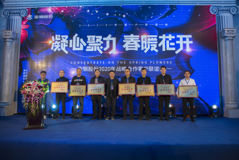 公司邀請48戶核心戰略合作伙伴共計180余人參加了會議。會上,公司黨委書記、董事長沈江山首先致歡迎詞;隨后部分客戶代表發表會議致辭(廣州廣鋼新材料公司、上海金通物產公司、黑龍江現代紅嘴鋼鐵經銷公司、遼寧固存興鋼鐵供應鏈管理公司、瓦房店軸承股份公司、遼寧方大國際貿易公司),我的鋼鐵網資深分析師甘遐勇先生做了《2020年國內鋼礦市場回顧及2021年行業發展展望》專題報告;銷售處長、供應處長宣布了2020年金牌分銷商、金牌供應商評選結果并主持頒獎。最后,公司總經理蔣俊對金鋼股份2020年工作進行了簡要總結,對2020年品牌建設、市場開發、經營業績進行了全面盤點,對2021年經營目標、計劃安排、市場布局、營銷重點進行了重點介紹,并對下一步客戶合作提出了新的目標和期望。會后進行了答謝酒會。